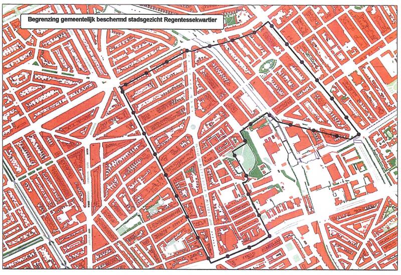 -het stedenbouwkundige patroon naar ontwerp van ir. I.A. Lindo uit 1891 met de kenmerkende verkeersdiagonalen in de vorm van de Regentesselaan en de Constant Rebecquestraat,