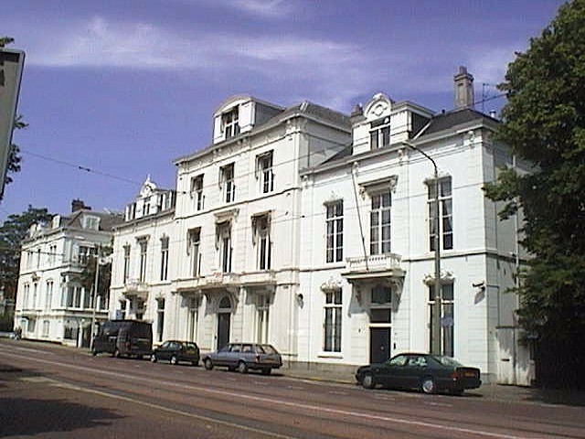 Linkerdeel van een symmetisch witgepleisterd bouwblok van drie herenhuizen uit 1860 in eclectische stijl. Het pand telt twee bouwlagen en een kapverdieping. Boven de risalerende ingangstravee is een attiekachtige dakkapel. Stucdecoraties bevinden zich boven de vensters.