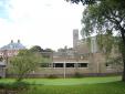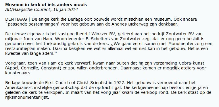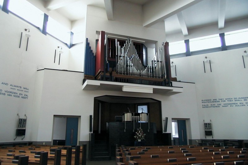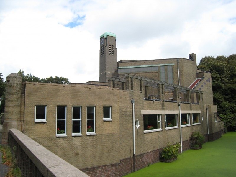 Complex van de First Church of Christ, Scientist. Op verschillende niveau's gesitueerd COMPLEX VAN GEBOUWEN, gegroepeerd rondom de op waaiervormige plattegrond ontworpen kerk, met toren aan de kortste zijde, te linkerzijde de kosterswoning, te rechterzijde de zondagsschool en daartussen in de bestuurskamer en de ingangspoort, gebouwd 1925-27 naar ontwerp van H.P. Berlage, met medewerking van Piet Zwart (interieur).