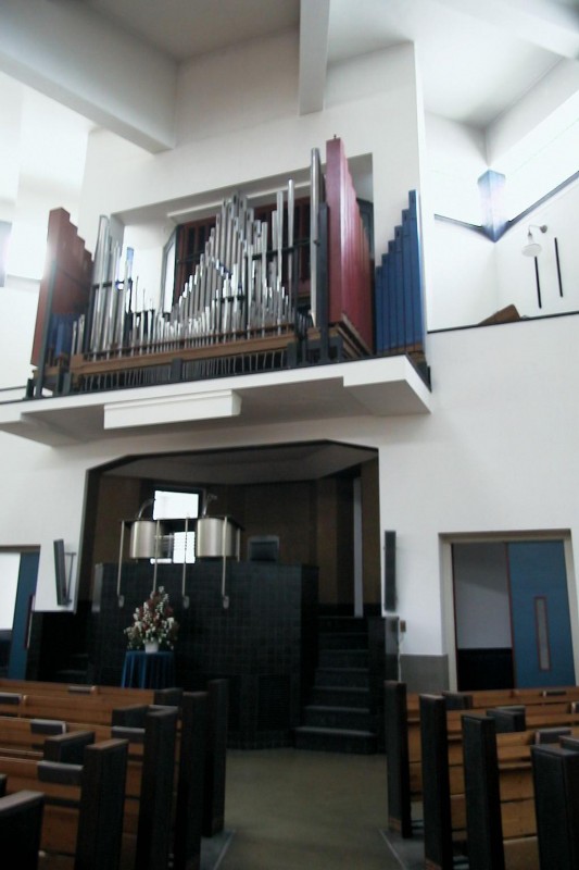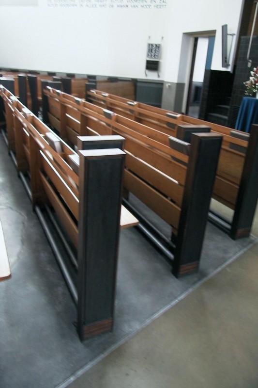 Alle gebouwen zijn opgetrokken in gele baksteen, met lambrizering van rode stenen, en plat afgedekt, met uitzondering van de lage kosterswoning, die een met pannen gedekte mansardekap bevat. De muren van de kerk zijn voorzien van glazen bouwsteenstroken zowel verticaal, als -hoog- horizontaal aangebracht, ter verlichting van het inwendige der kerk. De toren bevat een wijzerplaat aan de oostzijde en galmgaten aan alle zijden en een eenvoudige, met koper gedekte kap met afgeronde hoeken. Het interieur der kerk is voorzien van witgepleisterde wanden met tegellambrizering in blauw en zwart, met zichtbaarmaking van de betonconstructie (balken en pijlers); in de korte wand een nis met spreekgestoelte en daarbovenuit- kragend het orgel. Het orgel, in 1927 gebouwd door G. van Leeuwen, is pneumatisch en heeft een open frontopstelling, tegen de westzijde een balcon met grote overspanning. In het plafond in het midden een driehoekig gedeelte een tienhoekig bovenlicht met geometrische bepaalde onderverdeling.