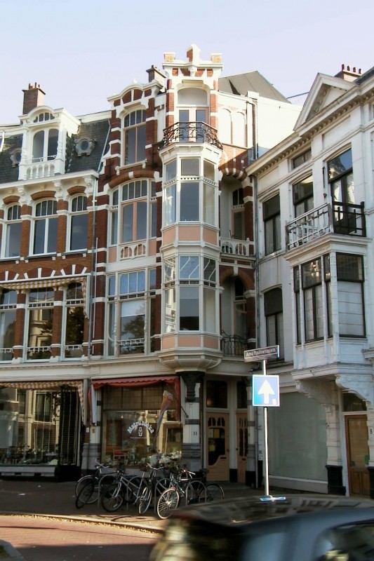 In de travee links van de erker zijn de vensters van de verdiepingen gevat in een hoge nis met segmentboog en houten vulling met snijwerk. Bij dit hoekpand is de bakstenen gevel opgetrokken tot voor de zolderverdieping, waarvan de vensters geprofileerde lateien bezitten. De bovenlichten van de ramen in de eerste verdieping vertonen Art Nouveau glas-in-lood. In het basement van de hoekpilaster onder de erker is aan de zijde van de portiek gebeeldhouwd: "J.W. Bosboom 1900" Nr. 12/13 bezit een lijstgevel waarvan de kroonlijst wordt gedragen door forse consoles met gebeeldhouwde koppen. Boven de vensters van de eerste verdieping zijn ontlastingsbogen met geblokte hanekammen toegepast. De vensters van de tweede verdieping reiken met hun getoogde bovenkant tot aan de kroonlijst. De grote houten dakkapel met hoekbalusters, balusterhek en gebogen afdekking wordt geflankeerd door twee oeil-de-boeufs. In de portiek naast het etalagevenster bevinden zich de deuren met bovenlichten naar het bovenhuis en de winkel, beide uitgevoerd in Art Nouveau. Glas-in-lood in deze stijl is ook toegepast in de bovenlichten van de ramen in de eerste verdieping. Boven de ingang van de portiek is siersmeedwerk in Art Nouveau aangebracht. In het basement van de rechter pilaster bij de portiekingang is de naam van de architect, J.W. Bosboom, gebeeldhouwd.