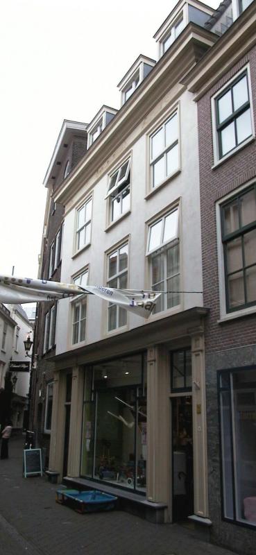 Achttiende eeuws pand (mogelijk in de kern nog zeventiende eeuws) met een drie-assige gepleisterde lijstgevel en bestaande uit parterre en twee ver diepingen onder dwars zadeldak. Pilasterpui uit de tweede helft van de 19de eeuw. Zesruitsschuiframen.