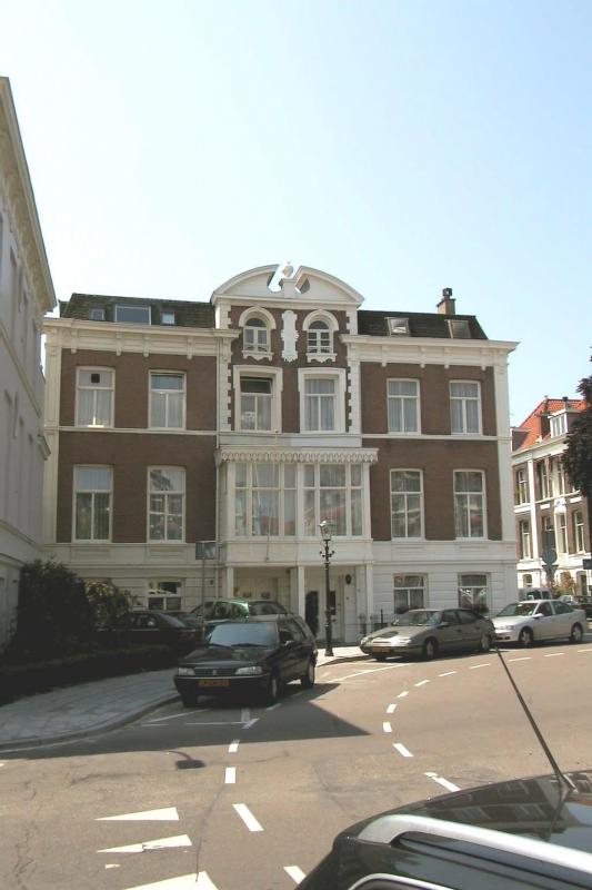 Herenhuis op rechthoekige plattegrond, bestaande uit een gedrukte begane grond en twee verdiepingen onder een afgeknot met shingles gedekt schilddak. De gevels zijn van baksteen met uitzondering van de begane grond aan de voorzijde, die is voorzien van een geblokte bepleistering met rustica-effect en een hardstenen plint. De bouwlagen worden van elkaar gescheiden door geprofileerde, gepleisterde cordonlijsten. De hoek wordt gemarkeerd door een gepleisterde pilaster met verdiepte velden. De voorgevel is drie vensterassen breed, waarvan de rechter als risaliet is behandeld. Het risaliet vormt het twee assen brede middendeel van het dubbele herenhuis en bezit aan weerszijden gepleisterde hoekblokken. Tegen de eerste verdieping van het risaliet bevindt zich een rechthoekige houten erker met pilasters en een sierlijk gesneden daklijst. De erker rust op houten staanders met hardstenen voet. Hieronder zijn de beide voordeuren van de herenhuizen geplaatst, bestaande uit een paneeldeur met dubbele panelen, frontons en smeedijzeren roosters. Op de tweede verdieping bezit het risaliet twee schuifvensters met T-vormige kozijnen en een geprofileerde gepleisterde omlijsting. Ter hoogte van de zolderverdieping zijn twee getoogde vensters met lambrequins en gietijzeren raamhekjes, waartussen een staande cartouche met de naam van het pand. De hoger opgetrokken risaliet wordt bekroond door een gebroken segmentvormig fronton met siervaas op piedestal. De overige schuifvensters bezitten T-vormige kozijnen. De vensters van de eerste verdieping worden aan de onderzijde verbonden door een brede gepleisterde lijst met rechthoekige panelen, die zich in dezelfde trant over de erker voortzet. Het hoofdgestel wordt in het midden onderbroken door het risaliet en bestaat uit een fries met rechthoekige houten panelen en een kroonlijst op houten triglyfconsoles. Tegen de achtergevel is een aanbouw over begane grond en verdieping.