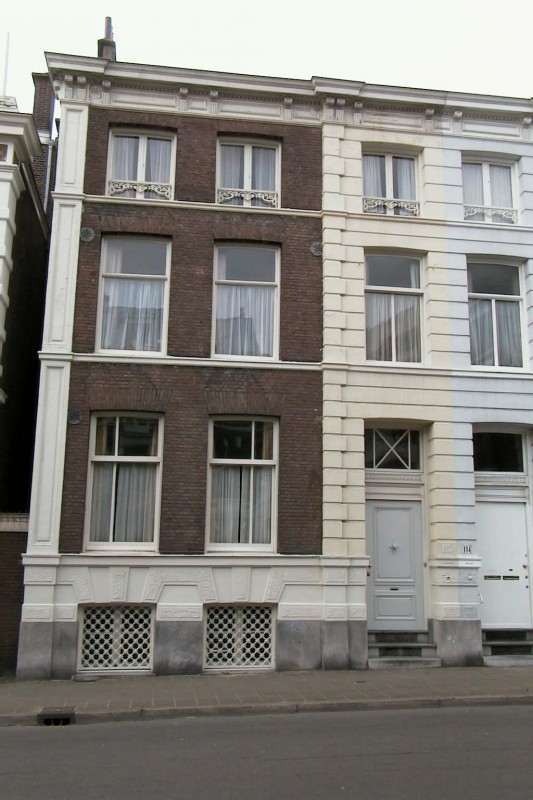 Herenhuis op rechthoekige plattegrond, bestaande uit een souterrain en drie bouwlagen onder een plat dak. De bouwlagen worden van elkaar gescheiden door geprofileerde, gepleisterde cordonlijsten. De bakstenen lijstgevel is drie vensterassen breed, waarvan de rechter als risaliet is behandeld en bezit een hardstenen plint. Het souterrain is voorzien van een geblokte bepleistering met rustica-effect. De hoek van de gevel wordt gemarkeerd door een pilaster met verdiepte velden. Het risaliet vormt het twee assen brede middendeel van de beide als eenheid ontworpen huizen en bezit een geblokte bepleistering. De in het risaliet geplaatste ingangspartij heeft een deur met rijk gesneden panelen met hoekrozetten, een deurkalf met diamantkopjes en een bovenlicht. De deur is bereikbaar via een hardstenen trapje met roosters. Op de eerste en tweede bouwlaag bevinden zich schuifvensters en op de derde stolpramen. De vensters op de eerste bouwlaag bezitten een uit het midden geplaatste en in het bovenlicht doorlopende middenstijl; op de tweede bouwlaag bezit het venster in het risaliet een T-kozijn. De gekoppelde souterrainvensters zijn voorzien van gietijzeren roosters. Voor de stolpramen zijn gietijzeren raamhekjes geplaatst. Het gekorniste hoofdgestel heeft een gepleisterd fries met rechthoekige panelen en een tandlijstje. De kroonlijst wordt gedragen door paarsgewijs geplaatste triglyfconsoles. De linkerzijgevel is gepleisterd.