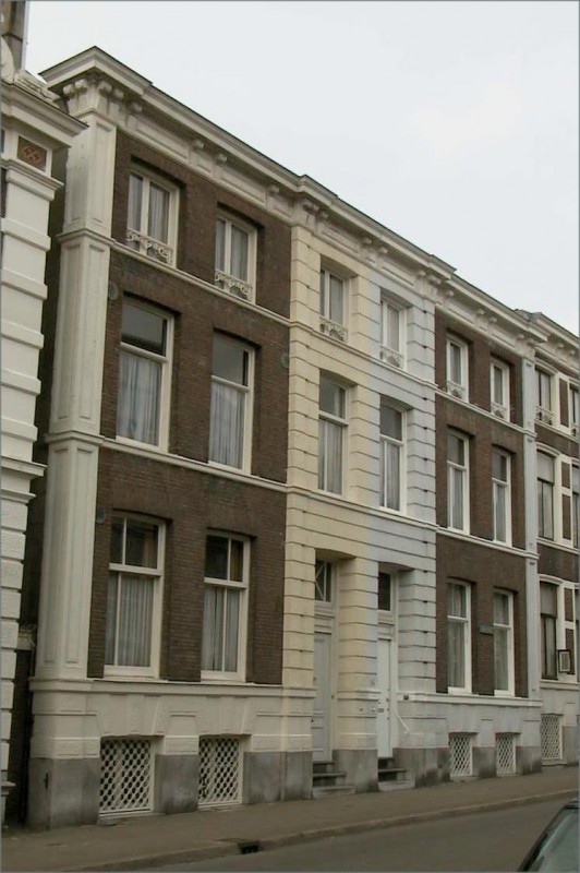 Herenhuis op rechthoekige plattegrond, bestaande uit een souterrain en drie bouwlagen onder een plat dak. De bouwlagen worden van elkaar gescheiden door geprofileerde, gepleisterde cordonlijsten. De bakstenen lijstgevel is drie vensterassen breed, waarvan de linker als risaliet is behandeld en bezit een hardstenen plint. Het souterrain is voorzien van een geblokte bepleistering met rustica-effect. De hoek van de gevel wordt gemarkeerd door een pilaster met verdiepte velden. Het risaliet vormt het twee assen brede middendeel van de beide als eenheid ontworpen huizen en bezit een gebloktebepleistering. De in het risaliet geplaatste voordeur heeft een deurkalf met diamantkopjes en een bovenlicht. De deur is bereikbaar via een hardstenen trapje met roosters. Op de eerste en tweede bouwlaag bevinden zich schuifvensters en op de derde stolpramen. De vensters op de tweede bouwlaag bezitten T-kozijnen. De gekoppelde souterrainvensters zijn voorzien van gietijzeren roosters. Voor de stolpramen zijn gietijzeren raamhekjes geplaatst. Het gekorniste hoofdgestel heeft een gepleisterd fries met rechthoekige panelen en een tandlijstje. De kroonlijst wordt gedragen door paarsgewijs geplaatste triglyfconsoles.