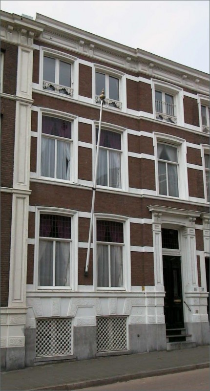 Herenhuis op rechthoekige plattegrond, bestaande uit een souterrain en drie bouwlagen onder een plat dak. De bouwlagen worden van elkaar gescheiden door geprofileerde, gepleisterde cordonlijsten. De bakstenen lijstgevel bezit een hardstenen plint en gepleisterde banden. Het souterrain is voorzien van een geblokte bepleistering met rustica-effect. De gevel is drie vensterassen breed, waarvan de rechter als risaliet is behandeld. Het risaliet vormt het twee assen brede middendeel van de beide als eenheid ontworpen huizen. De in het risaliet geplaatste ingangspartij heeft een deur met rijk gesneden panelen, een deurkalf met diamantkopjes en een glas-in-lood bovenlicht. De deuromlijsting wordt gevormd door pilasters met verdiepte velden en een gekorniste kroonlijst op paarsgewijs geplaatste triglyfconsoles. De deur is bereikbaar via een hardstenen trapje met roosters. Op de eerste en tweede bouwlaag bevinden zich schuifvensters en op de derde stolpramen, alle voorzien van een geprofileerde, gepleisterde omlijsting. De schuifvensters bezitten T-kozijnen en glas-in-lood bovenlichten, met uitzondering van het matglazen bovenlicht in het risaliet. De gekoppelde souterrainvensters zijn voorzien van gietijzeren roosters. Voor de stolpramen zijn gietijzeren raamhekjes geplaatst. Het gekorniste hoofdgestel heeft een gepleisterd fries met rechthoekige panelen en een tandlijstje. De kroonlijst wordt gedragen door paarsgewijs geplaatste triglyfconsoles.