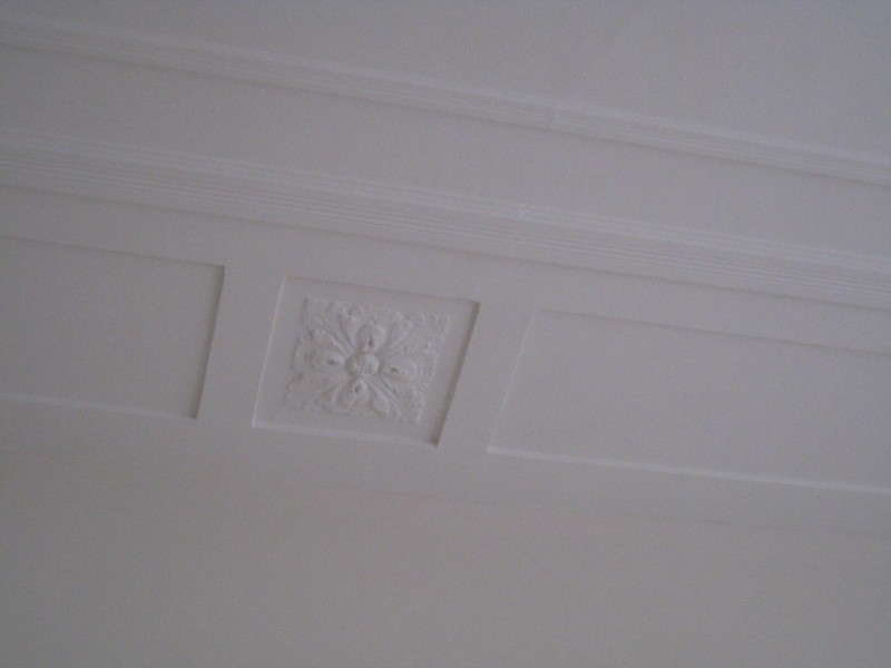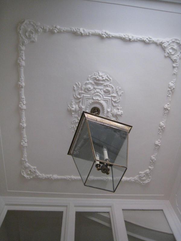 Het gekorniste hoofdgestel heeft een gepleisterd fries met rechthoekige panelen en een tandlijstje. De kroonlijst wordt gedragen door paarsgewijs geplaatste triglyfconsoles.