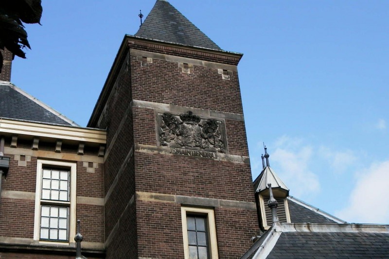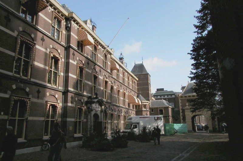 DEPARTEMENT VAN BINNENLANDSE ZAKEN, gebouwd in 1913; aan de zijde van de Hofvijver een achthoekig torentje uit de 15e eeuw en een in oorsprong eveneens middeleeuwse gekanteelde, torenvormige gevel.
