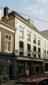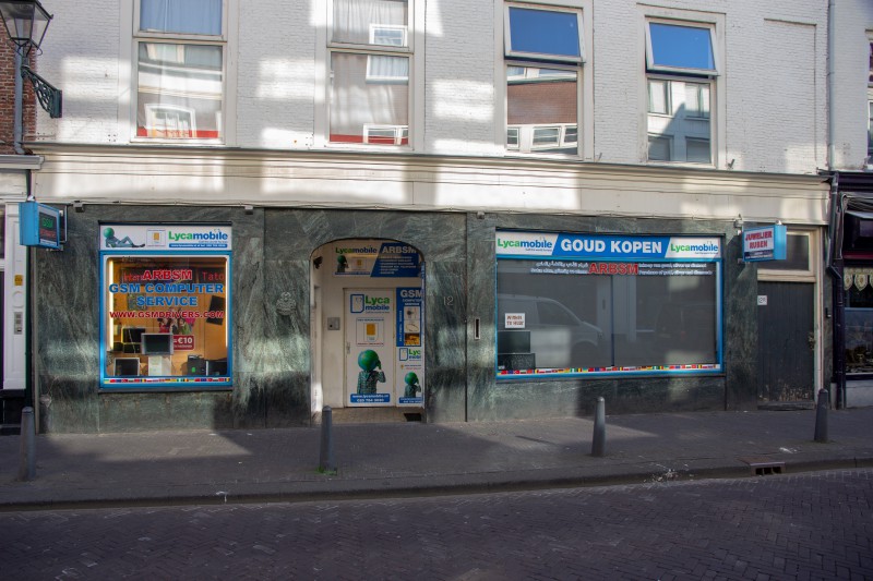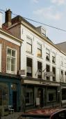 Achttiende eeuws pand, bestaande uit twee samengevoegde zeventiende eeuwse huizen met parterre en twee verdiepingen onder dwars schilddak met haaks daarop zadeldaken. Oorspronkelijke kappen, zesruitsdakkapel en trap. Wit gesausde lijstgevel ter breedte van vier vensterassen plus smallere dichte vijfde as; vensters onder rollagen en vijf staafmuurankers. Vroeg-20ste eeuwse winkelpui, voor het laatst in de vijftiger jaren verbouwd en rechts een dichtgemaakte poort.