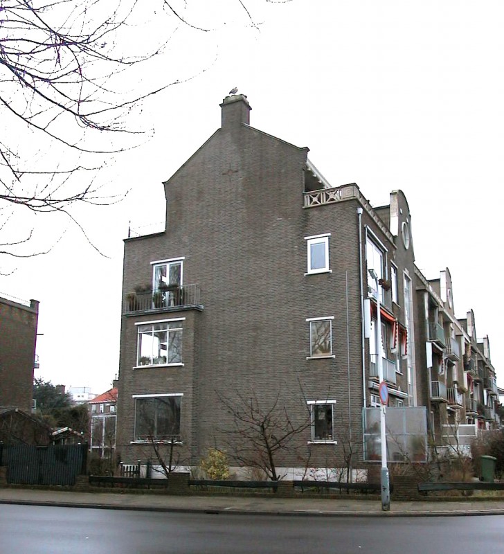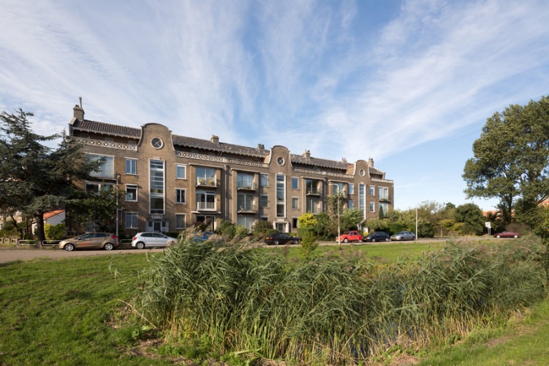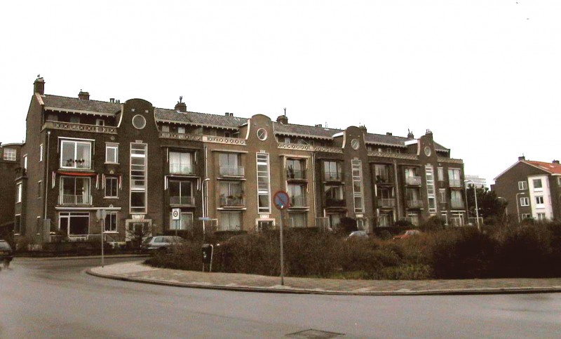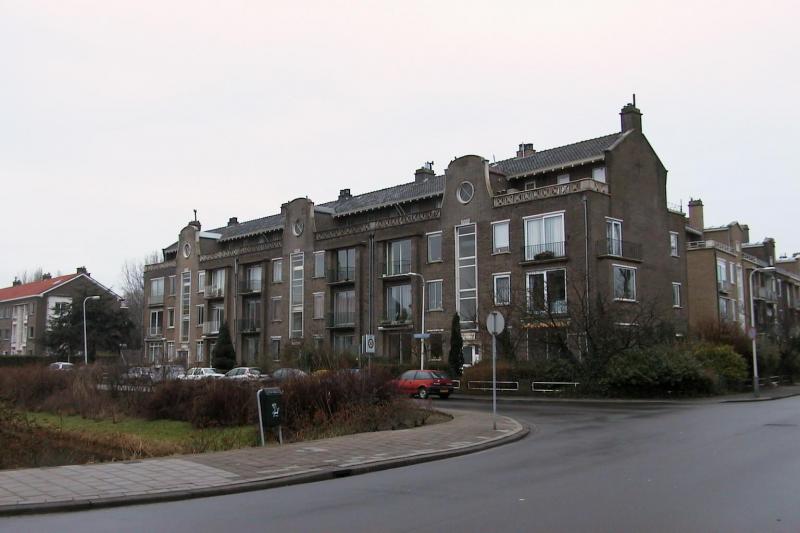 Twee traditioneel vormgegeven bouwblokken met portiekwoningen in de wijk Bohemen voor de gegoede middenstand uit 1950-1952 naar ontwerp van het architectenbureau Blankespoor & De Vries.