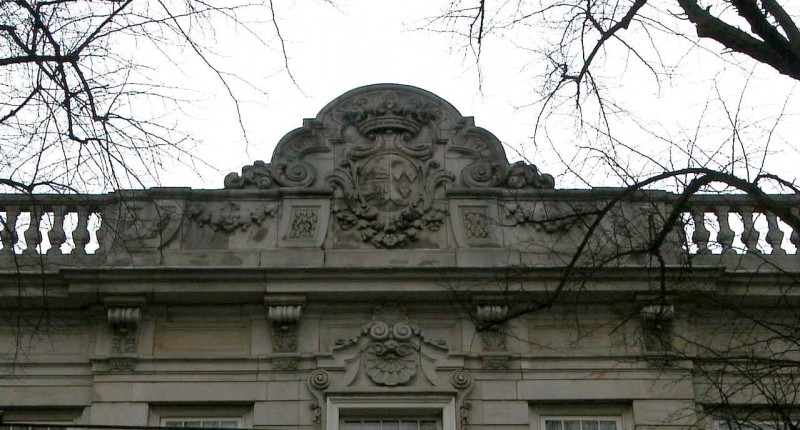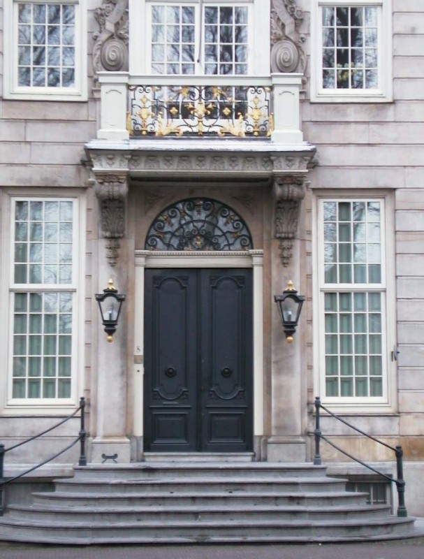 Pand in Lodewijk XIV- stijl welke bestaat uit souterrain, twee hoge bouwlagen en een lagere derde bouwlaag onder kap. De monumentale met zandsteen beklede voorgevel is 7 assen breed, waarvan de middelste drie licht risalerend zijn uitgevoerd. De centraal gesitueerde ingangstravee is rijk geornamenteerd met Lodewijk XIV- motieven. Boven de ingang is een balkon met ijzeren hekwerk. Boven de kroonlijst wordt de gevel beindigd met een natuurstenen open balustrade, in het midden voorzien van een rijk gebeeldhouwd fronton en op de hoeken siervazen. De schuifvensters met kleine roedeverdeling in 18e eeuwse trant zijn bij een 20e eeuwse restauratie aangebracht. In de 19e eeuw waren Empire-vensters geplaatst. Gebouwd naar ontwerp van Daniel Marot in opdracht van Cornelis van Schuylenburch. Felix du Sart had de leiding bij de uitvoering van de bouwwerkzaamheden.