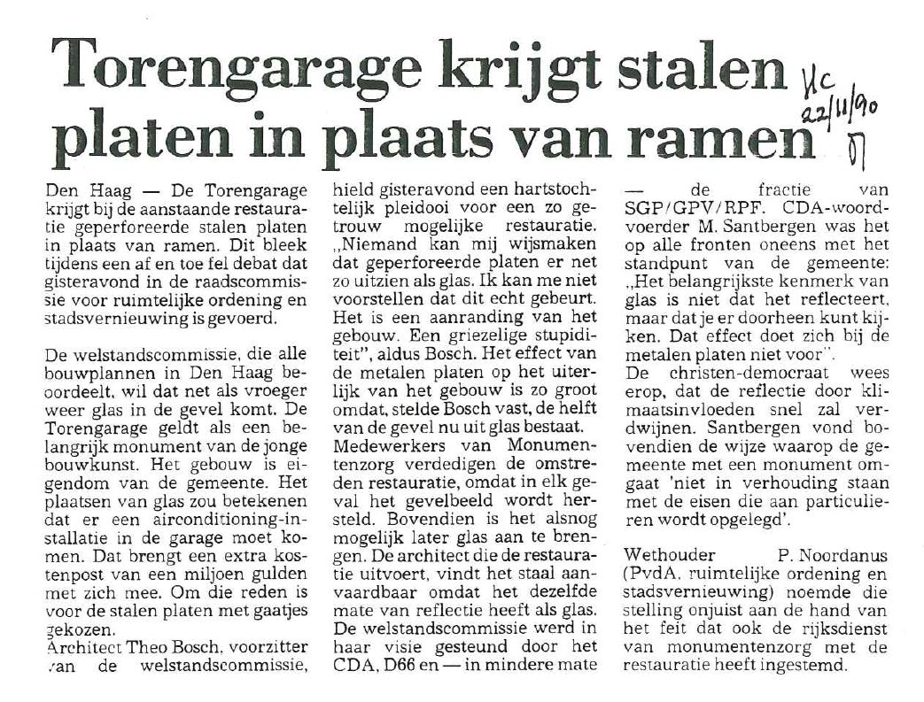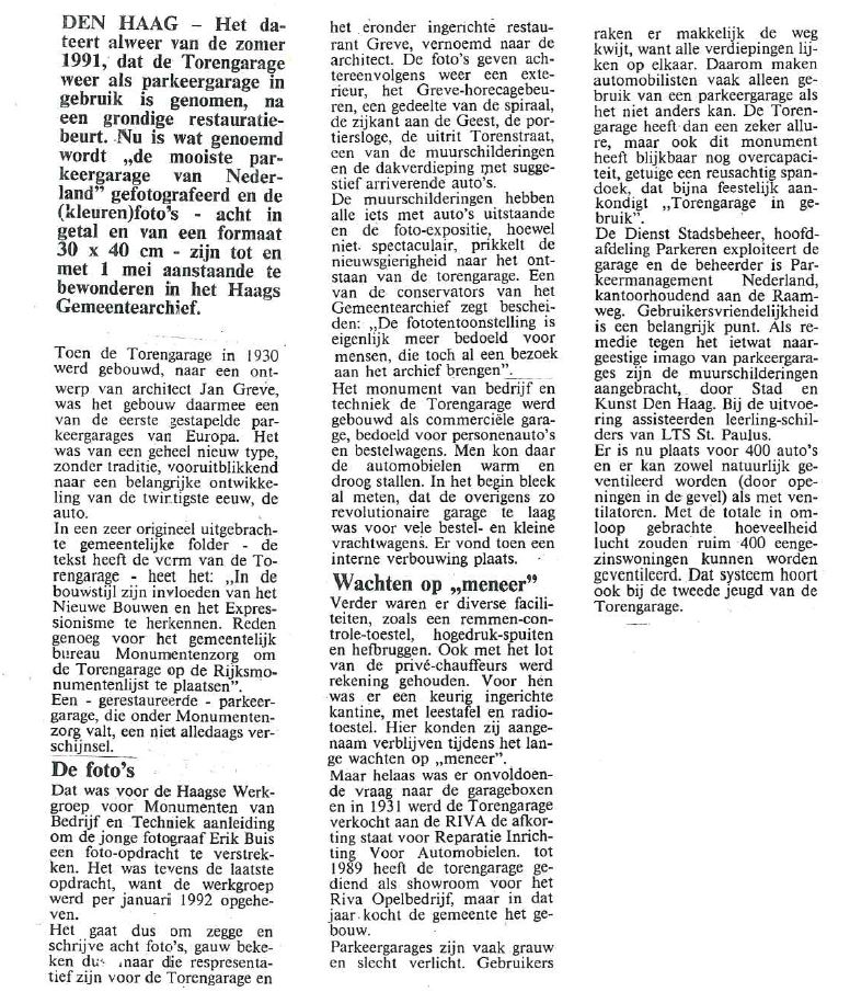 Garagebouw met nevenruimten van voor de tijd van ontstaan karakteristieke expressionistisch-zakelijke architectuur wegens de toepassing van enerzijds markante metseldetails en in elkaargrijpende blokvormige bouwvolumes en halfcilindrische lantaarns en anderzijds een geheel op de diverse functies gerichte vormgeving - door de invoering van een pseudo-ellipsoidale grondvorm met bijbehorende hellingbanen, doorgezet tot op het dak, en afwijkende, cubische grondvormen voor anders bestemden ruimten - alsook een geheel op de gebruikte bouwmaterialen afgestemde vormgeving met een welbewust zichtbaar gemaakt gebruik van een betonskelet met bakstenen bekledingsmuren, doorbroken door lange vensterstroken, en met uit staal en glas opgebouwde erkerpartijen; voorts van belang in typologisch opzicht als eerste voorbeeld in Nederland van een als zodanig gebouwde parkeergarage, als oplossing voor het parkeervraagstuk in de binnenstad, en tevens van stedebouwkundige betekenis wegens de ligging in de knik van de Torenstraat, ontstaan in samenhang met de in 1924 uitgevoerde verkeersdoorbraak.
