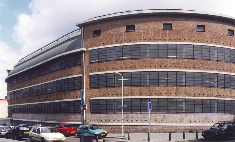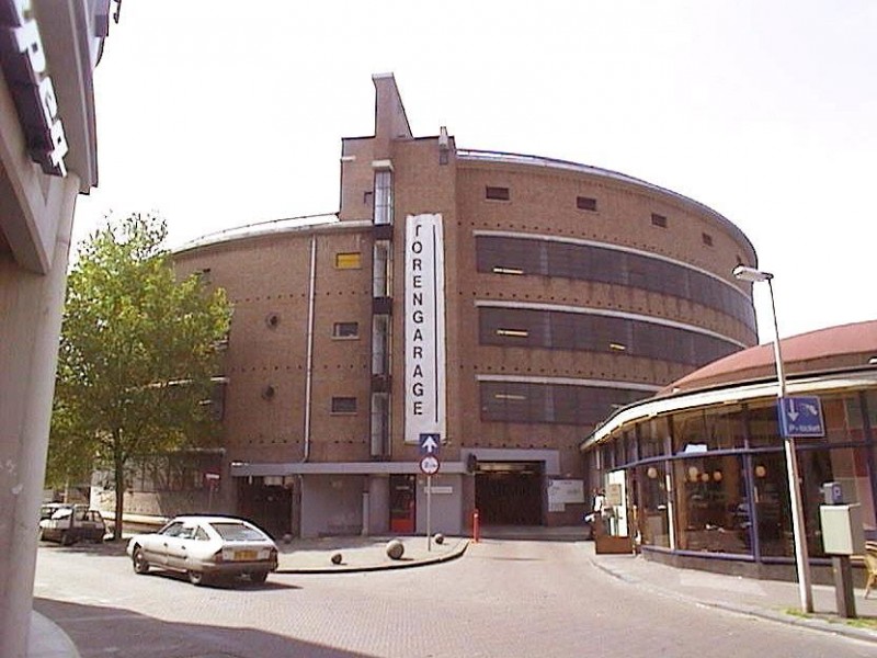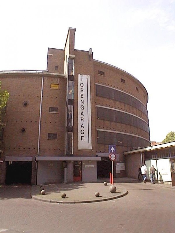 Onderkelderd GARAGEGEBOUW met vijf hellende bouwlagen gegroepeerd rondom een wigvormige lichthof en met uitgebouwde showroom, werkplaatsen en kantoren, opgetrokken met behulp van een betonskelet op een grondslag van een onregelmatige ellips, met bakstenen muren waarbij de inwendige hellingbanen - die per bouwlaag een hoogteverschil van 3 m.overbruggen - worden weerspiegeld in de schuingeplaatste vensterstroken die over vrijwel de volle gevelbreedte op de eerste, tweede en derde verdieping zijn aangebracht - onderbroken bij het trappenhuis dat aan het Z-einde van de circa 60 m. lange lengte-as tegen de meest uitstulpende gevelwand is gesitueerd - uitgevoerd in 1929-'30 naar ontwerp van J.Greve in een expressionistisch getinte, zakelijke stijl.