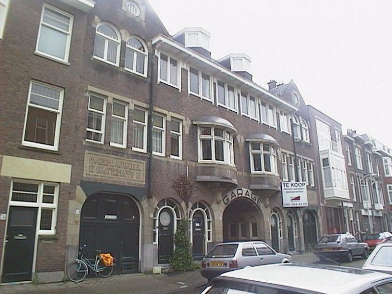 Garage met bovenwoningen uit 1911 van de architect W. Greve jr. bestaande uit twee bouwlagen en een kapverdieping. De symmetrisch opgebouwde gevel is zorgvuldig afgewerkt. In de eindtravee zijn brede inrijpoorten, waarboven aan elke zijde een forse gevelsteen, waarop de tekst " Haagsche Automobiel Maatschappij" is aangebracht. De in het midden gesitueerde brede doorgang (ter rechterzijde gesigneerd door de architect) naar de op het binnenterrein gelegen authentieke garageboxen, wordt aan beide zijden geflankeerd door de gekoppelde rondboogvormige ingangen van de bovenwoningen. De oorspronkelijke deuren zijn nog aanwezig. De begane grond bezit een hoge hardstenen plint. De penanten tussen de verschillende openingen van de begane grond zijn bekleed met hardsteen. In de gevel is op meerdere plaatsen beeldhouwwerk toegepast, ondermeer aan de onderzijde van de twee ronde erkers ter hoogte van de verdieping. In de kap zijn twee driezijdige dakkapellen.