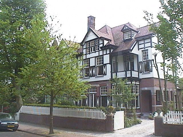 Linkerdeel van dubbelvilla op rechthoekige plattegrond, bestaande uit twee bouwlagen onder een met pannen gedekte samengestelde kap. Het dak bezit hoge gemetselde schoorstenen, pirons en dakkapellen met driehoekig fronton met vakwerk. De bakstenen gevels zijn op de tweede bouwlaag gepleisterd. De rechteras van de voorgevel is als risaliet behandeld en bezit een top met vakwerk en driehoekig fronton met houten briefpanelen. Links daarvan bevinden zich op de eerste en tweede bouwlaag respectievelijk een erker en een veranda met houten balustrade, onder een lessenaarsdak op houten staanders. Op de hoek bevindt zich een ronde arkeltoren met vakwerk, gedekt door shingles. Onder de arkeltoren is de ingang - een houten paneeldeur - in een bakstenen portaal met hardstenen onderdelen gesitueerd. De vensters bezitten houten kozijnen en zijn voor het merendeel onderverdeeld in kleine roeden. In de bovenlichten is gekleurd glas aangebracht. De vensters en openslaande deuren op de begane grond van de risaliet zijn voorzien van een hardstenen omlijsting aan de bovenzijde. De drie assen brede zijgevel verspringt naar achteren toe; in het middendeel is een zij-ingang met daarboven een hoog houten kruisvenster met glas-in-lood. Tegen het achterste deel bevindt zich een hoge uitgemetselde schoorsteen. Aan de bovenzijde van de gevel is vakwerk aangebracht.