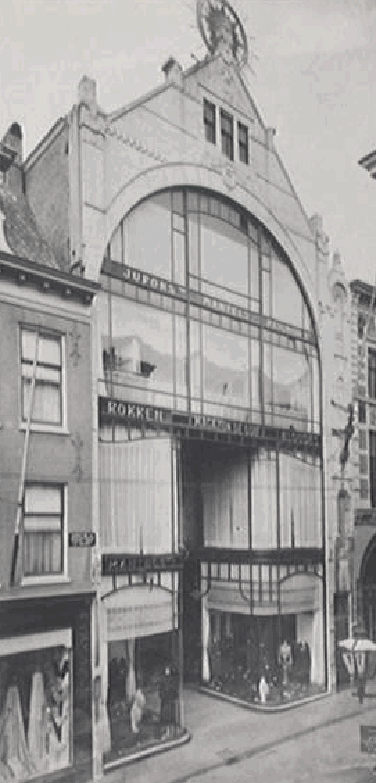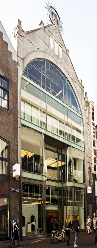 Molenbroek ontwierp een modieuze glasgevel van zachtgrijze hardsteen die met motieven in de stijl van de Wiener Sezession is gedecoreerd. Daarbinnen bevindt zich een groot boogvormig glasoppervlak dat over drie lagen doorloopt. Het glas was oorspronkelijk door stijlen in een sierlijk patroon onderverdeeld. Voor het glas waren ijzeren balken geplaatst waarin met behulp van uitgespaarde letters het assortiment stond vermeld, zoals ‘jupons’, rokken en mantels. De winkelpui was twee lagen hoog met naar binnen gebogen etalages die een diep portiek omzoomden.