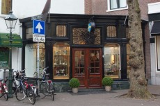 De eenlaagse winkel, in feite niet meer dan een forse winkelpui, is gebouwd naar een historiserend ontwerp van W. de Vrind jr. De houten pui op stenen borstwering heeft drie zijden met in het brede middendeel de entree. Bijzonder is de voor die tijd zeker nostalgisch ogende stijl. Wellicht een bewuste keuze van de opdrachtgever die in de winkel antiek en schilderijen uitstalde. De oorspronkelijke deuren en rijke versiering in het bovenlicht zijn niet bewaard gebleven. De huidige invulling is hiervan wel een goede benadering.