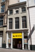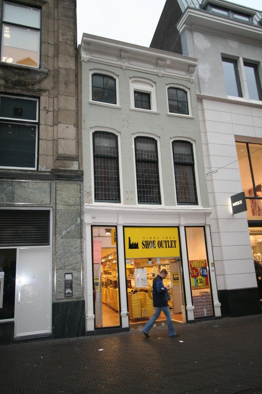 De voorgevel is een op vlucht gebouwde drielaagse lijstgevel uit de tweede helft van de 18de eeuw, die vrij recent grijs geschilderd is. De verdiepingshoogte neemt in de gevel naar boven toe af. De gevel wordt afgesloten door een recht hoofdgestel met vier rijk gesneden Lodewijk XIV-consoles in het van spiegellijsten voorziene fries. Alle kozijnen bezitten bovendorpels met schouderbogen en dateren uit de bouwtijd. De raamindeling is van een latere periode. De rijke detaillering van de kozijnen en de kroonlijst duiden erop dat dit in de achttiende eeuw een voornaam woonhuis moet zijn geweest. In de tweede helft van de negentiende eeuw heeft het zijn huidige winkelfunctie gekregen. In 1888 werd een nieuwe winkelpui aangebracht die voor een belangrijk deel nog bewaard is gebleven.