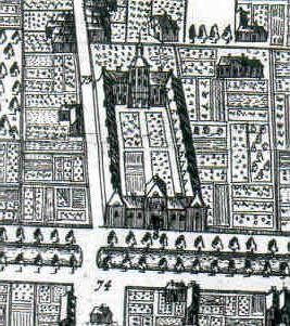 Dit is één van de grootste hofjes in Nederland en de bouw daarvan was destijds een zeer dure aangelegenheid. Het is gesticht door Johan de Bruijn van Buijtenwech, heer van Nieuwkoop, Noorden en Achttienhoven. Het huwelijk van de rijke De Bruijn en van zijn al even rijke vrouw Maria Cornelia van Duyvelandt van Rhoon, beiden van katholieke huize, was kinderloos gebleven. Er waren geen erfgenamen. In 1656 bepaalde hij in zijn testament dat na zijn overlijden (hij stierf in 1657) 'alhier in den Hage sullen worden gemaeckt sessendartich woonhuysen voor arme ende behoeftige weduwen ofte vrouwspersonen op soodanige manier als juffer VAN WOUW heeft gedaen maecken,..' . Hij noemt hier het hofje van Cornelia van Wouw aan de Lange Beestenmarkt als voorbeeld.