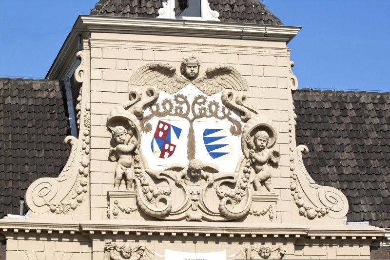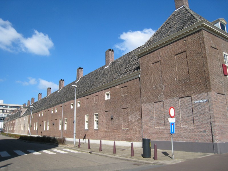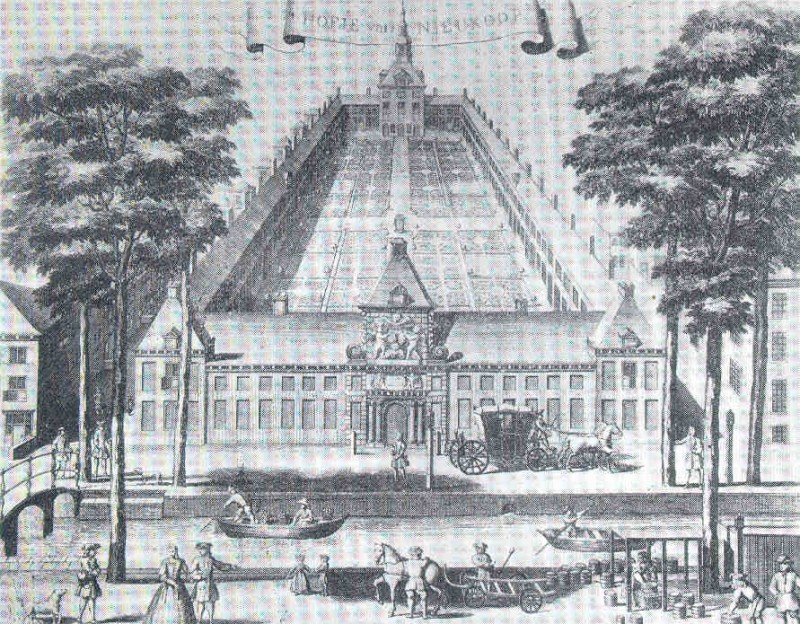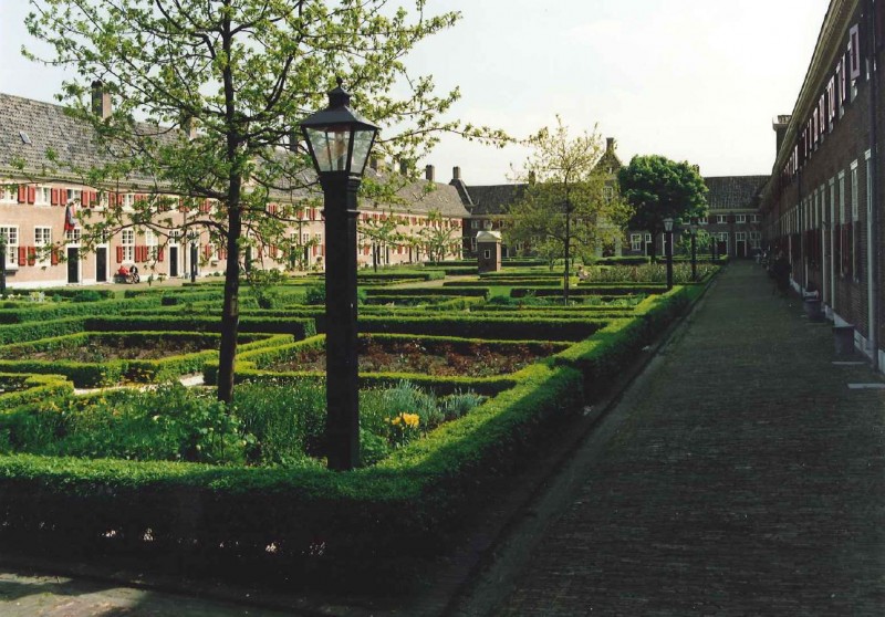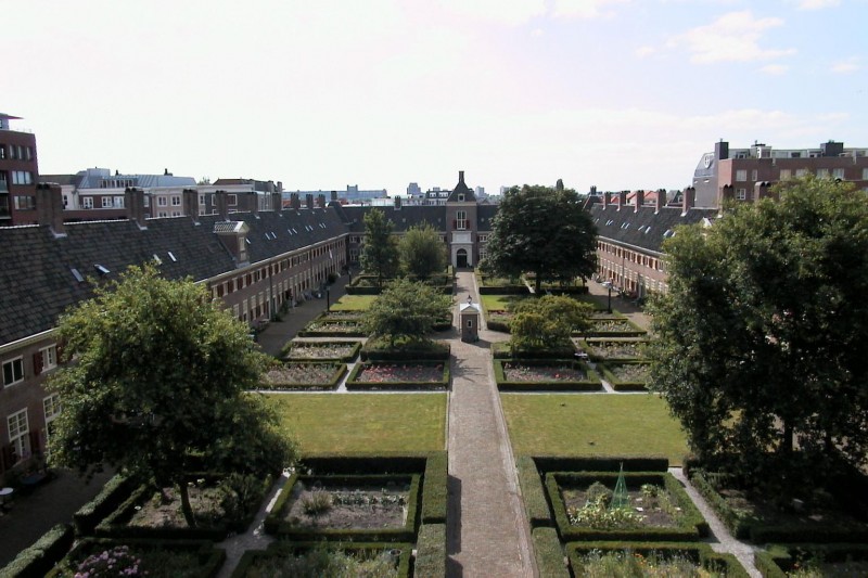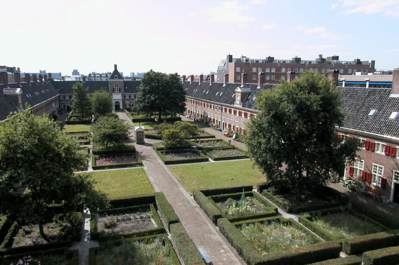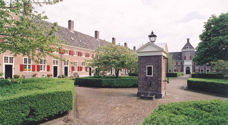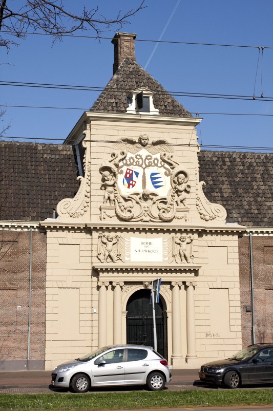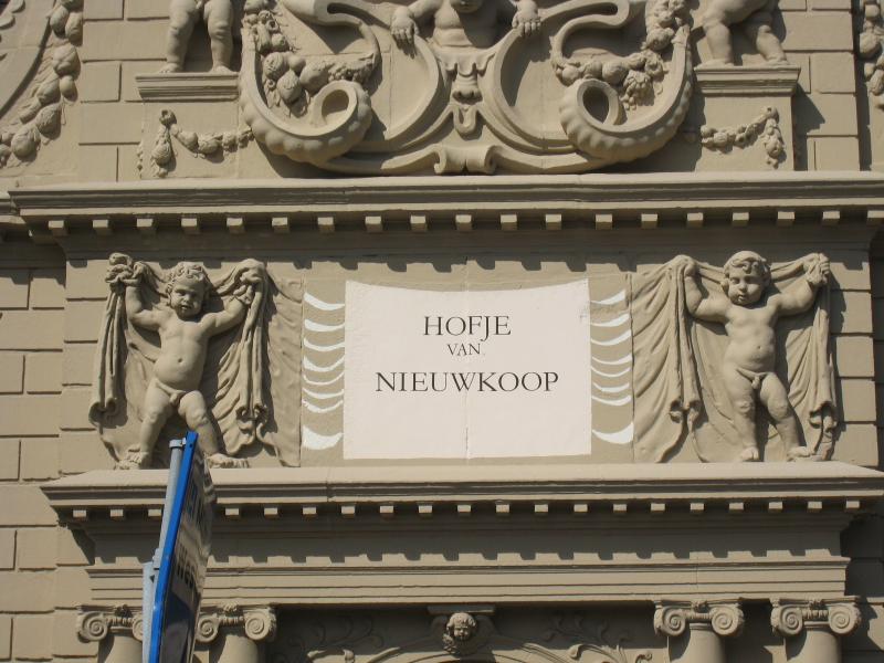Hofje van Nieuwkoop, omstreeks 1660 gebouwd door Pieter Post, natuurstenen omlijsting van de ingang met opschrift-cartouche - rijk versierde (oorspronkelijke) ingang aan de zijde van de Prinsengracht - in de regentenzaal schouw uit de stichtingstijd.