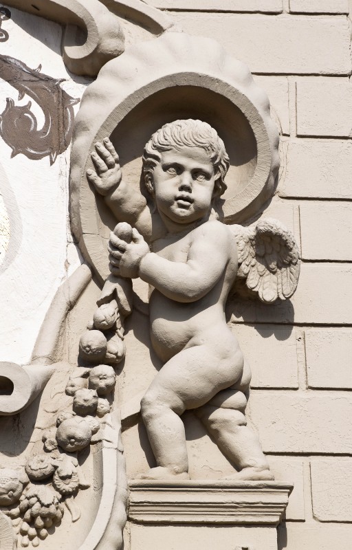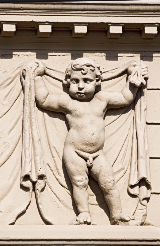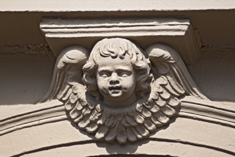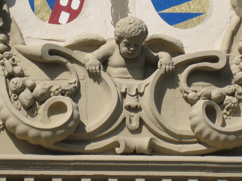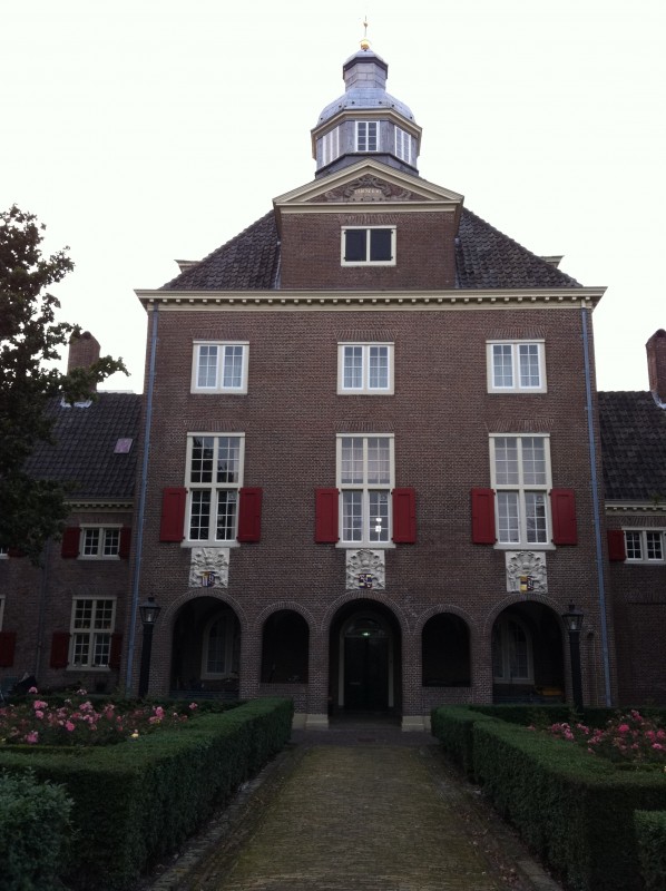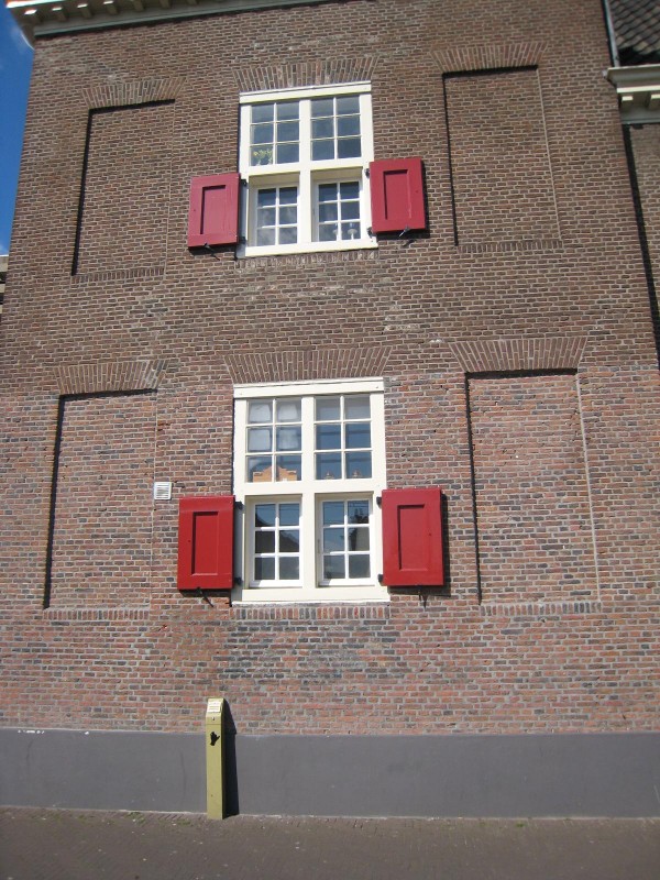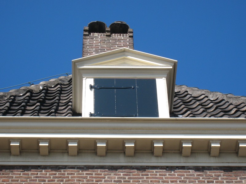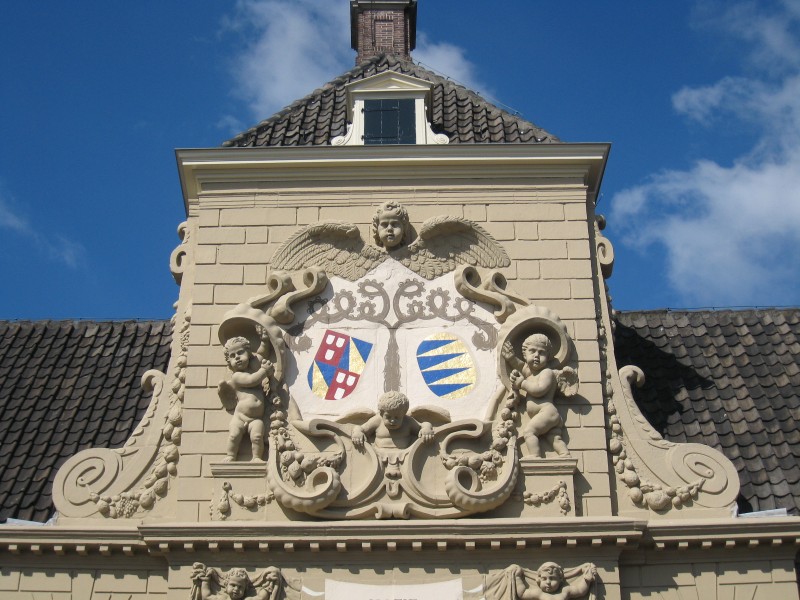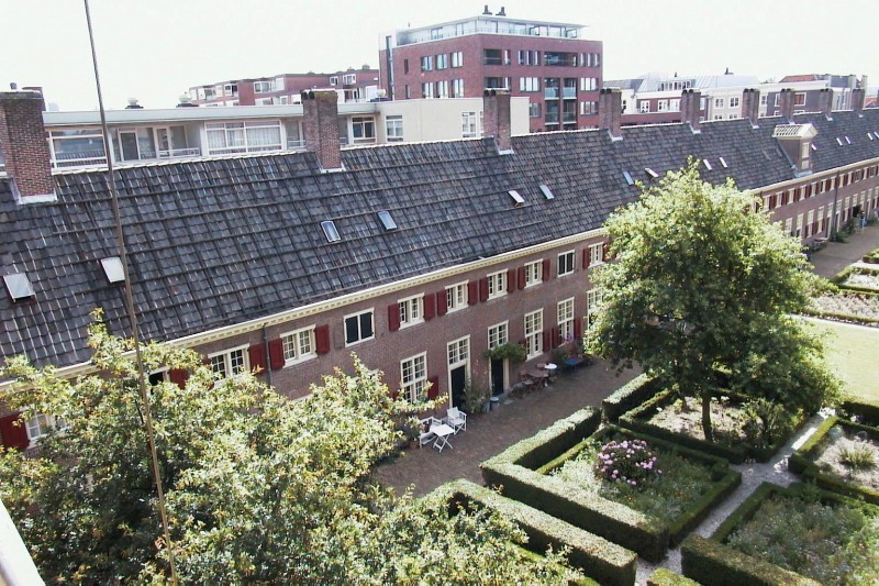 Hofje van Nieuwkoop, omstreeks 1660 gebouwd door Pieter Post, natuurstenen omlijsting van de ingang met opschrift-cartouche - rijk versierde (oorspronkelijke) ingang aan de zijde van de Prinsengracht - in de regentenzaal schouw uit de stichtingstijd.