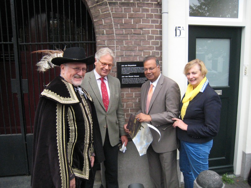Het eerste bord werd geplaatst op Dunne Bierkade 16, het pand waar in de 17de eeuw kunstschilder Jan van Goyen woonde en werkte.